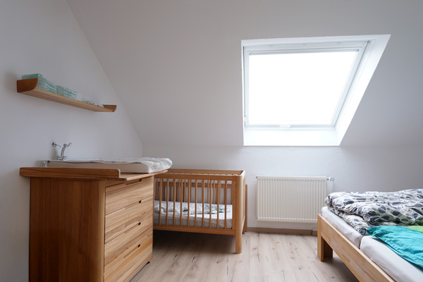 Im Schlafzimmer stehen zusätzlich ein Kinderbett und eine Wickelkommode zur Verfügung. So ist auch für die kleinsten Gäste bestens gesorgt.